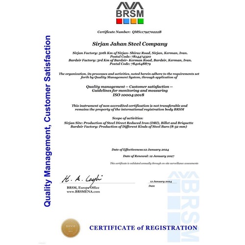 شرکت جهانفولاد سیرجان در ادامهی روند کسب موفقیتهای درخشان در سال ۱۴۰۲، توانست این بار در حوزهی مشتریمداری و در راستای تعهد به ارایهی محصولات تولیدی باکیفیت مطلوب، به عنوان اولین شرکت تولید کننده شمشهای فولادی در منطقهی معدنی و صنعتی گلگهر، گواهینامههای استاندارد ISO 10004(سیستم مدیریت رضایتمندی مشتریان) و استاندارد ISO 10002(سیستم مدیریت رسیدگی به شکایات مشتریان) را اخذ نماید