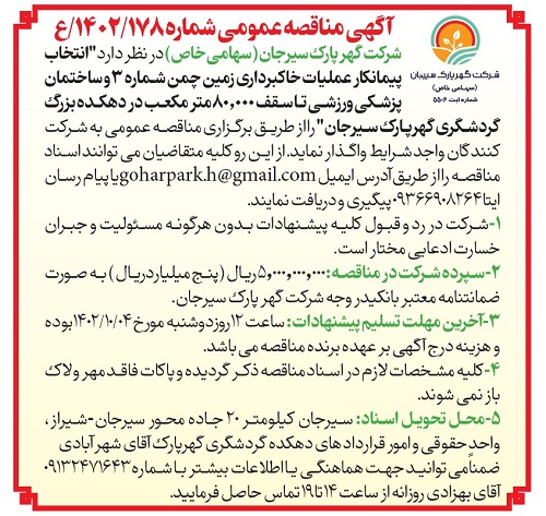 آگهی مناقصه عمومی شماره 1402/178/ع