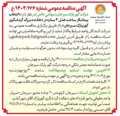 آگهی مناقصه عمومی شماره 1402/176/ع