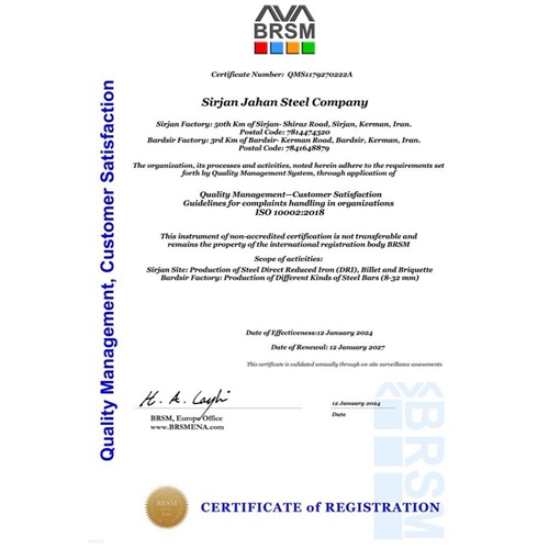 شرکت جهانفولاد سیرجان در ادامهی روند کسب موفقیتهای درخشان در سال ۱۴۰۲، توانست این بار در حوزهی مشتریمداری و در راستای تعهد به ارایهی محصولات تولیدی باکیفیت مطلوب، به عنوان اولین شرکت تولید کننده شمشهای فولادی در منطقهی معدنی و صنعتی گلگهر، گواهینامههای استاندارد ISO 10004(سیستم مدیریت رضایتمندی مشتریان) و استاندارد ISO 10002(سیستم مدیریت رسیدگی به شکایات مشتریان) را اخذ نماید