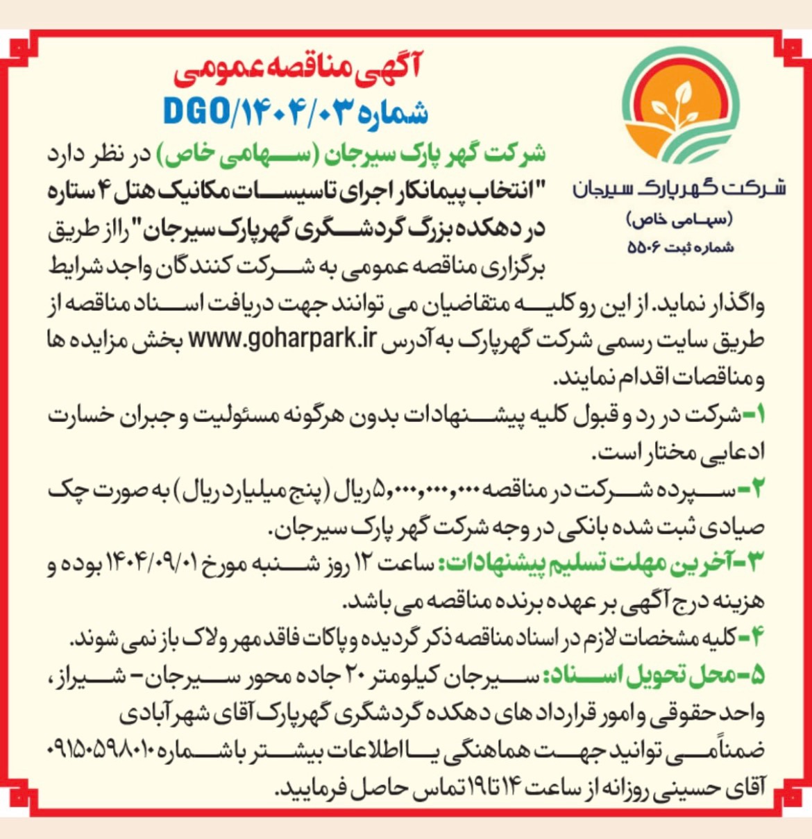 مناقصه عمومی شماره DG0/1404/03 " گهرپارک سیرجان"
